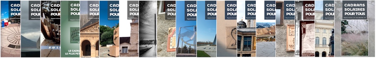 Enfin, à l’initiative d’Yvon Massé, membre du comité éditorial du magazine, il vous est désormais possible de télécharger ici une compilation de l’ensemble des numéros du magazine parus à ce jour, ce qui constituera, pour ceux qui le souhaitent, une base d’informations mise à jour périodiquement sur la gnomonique et les cadrans solaires, de près de 700 pages, base dans laquelle il leur est possible de faire des recherches par auteur, thème, mots-clés, etc.
