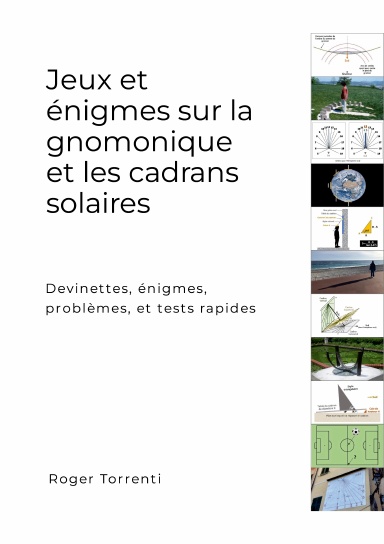 Ce livre, Jeux et énigmes sur la gnomonique et les cadrans solaires, préparé par Roger Torrenti, regroupe les devinettes, énigmes, problèmes gnomoniques, et tests rapides de la section Jeux et énigmes des 18 premiers numéros du magazine Cadrans solaires pour tous. Il peut être téléchargé gratuitement depuis http://bit.ly/48nwqhY ou commandé en version papier, au prix de 15 € via http://bit.ly/3IA6tRO